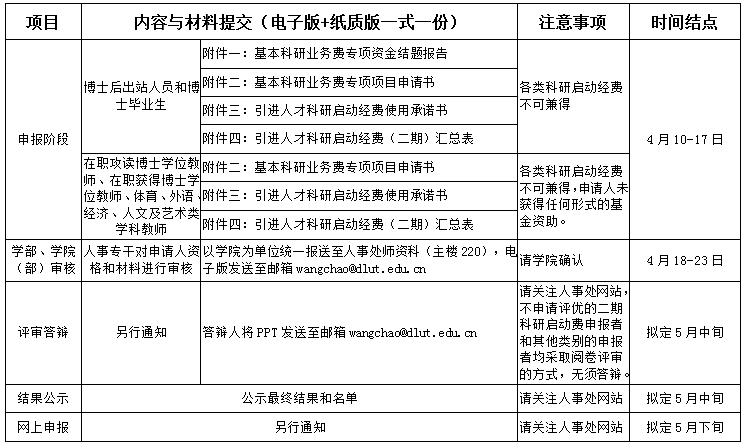2015年8月1日至2016年7月31日期间来校工作,来校时为中级及以下专业技术职务且受聘于教学、科研岗位的博士后出站人员和博士毕业生,一期科研启动经费结余为零且通过验收者,可以申请二期科研启动经费(2016年8月1日-9月30日期间来校并获得一期科研启动费资助,现已结题者也可申报)。二期科研启动经费将根据一期考核结果实施动态资助,对于一期考核优秀者,可根据评审意见提高二期科研启动经费的支持额度;对于一期考核良好者,保持原定的支持额度;对于一期考核合格者,根据评审意见可保持原定的支持额度,也可降低支持额度;一期考核不合格者,取消二期科研启动经费的支持。一期结题和二期申请表格请见《基本科研业务费专项项目结题报告》(附件一)和《基本科研业务费专项项目申请书》(附件二)。