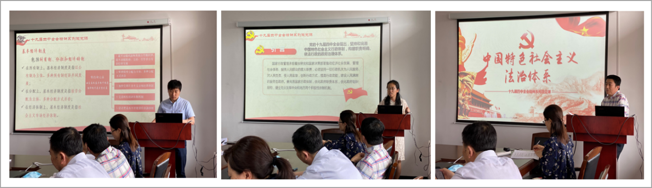 会议最后,张强、李占英、杨文超同志分别以《深刻理解社会主义基本经济制度的新内涵》、《坚持和完善中国特色社会主义行政体制》、《中国特色社会主义法治体系》为主题带领全体党员深入学习十九届四中全会“微党课”,帮助大家准确领会和把握十九届四中全会的精神内涵,不断推动全会精神深入人心。