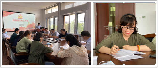 会议开始,全体党员起立奏唱《国歌》,接下来宋颖辉同志向支部汇报自己在预备期间的表现,总结在思想、生活、工作以及学习上的进步和不足,表达了加入中国共产党的坚定决心。入党介绍人厉龙和田琳两名同志对宋颖辉预备期内的表现情况做了全面而客观的分析评价,并发表自己的意见。支部书记杨文超代表支委会介绍宋颖辉在预备期间的教育和考察情况并提出转正意见。最后全体党员通过无记名投票,全票通过宋颖辉同志转为中国共产党员。杨文超书记进行总结发言,对宋颖辉同志转为正式党员表示衷心的祝贺,同时希望各位支部党员不忘初心,严格待己,展现党员良好的精神风貌。