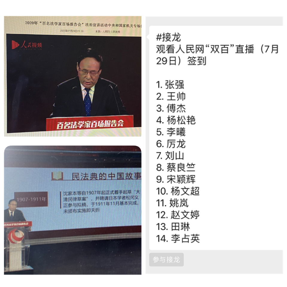 7月29日15时,2020年“百名法学家百场报告会”法治宣讲专场报告会通过人民网以视频会议形式进行直播,主题为宣传贯彻《中华人民共和国民法典》。为进一步增强人事处工作人员的法治意识,人事处党支部统一安排部署,以“全员学”的方式组织大家通过网络方式开展《中华人民共和国民法典》线上学习活动,大家充分利用网络资源进行认真学习。