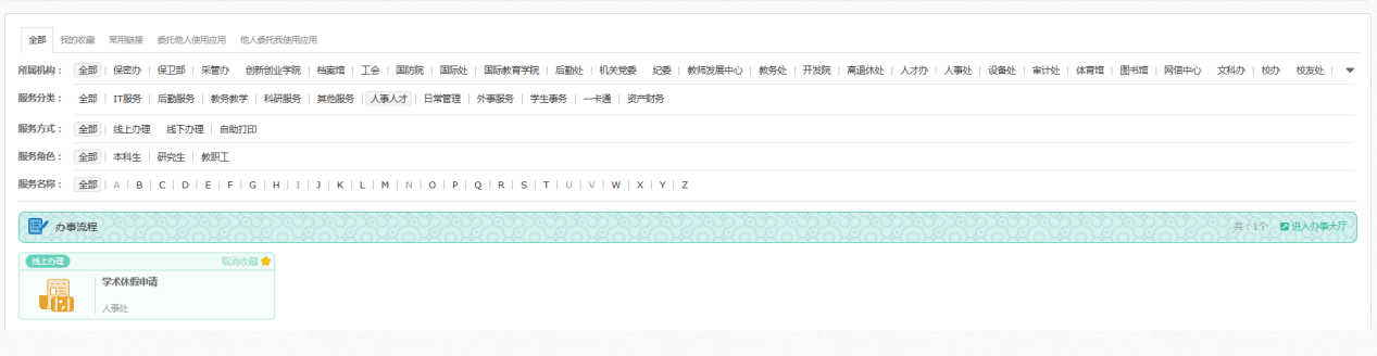 全校教职工、自聘人员可进入“校园门户”-“办事中心”中,通过搜索“学术休假申请”或在“服务分类”-“人事人才”或在“所属机构”-“人力资源处”分类服务下找到【学术休假申请】服务。